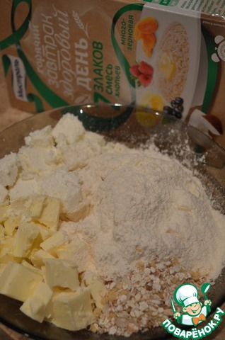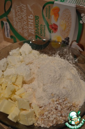 Сливочное масло комнатной температуры порубить на куски и смешать с хлопьями, творогом, мукой и солью.