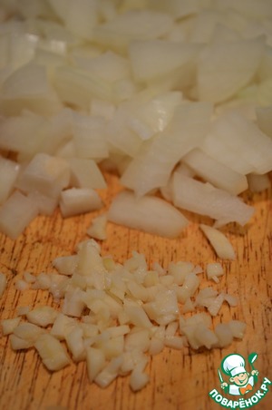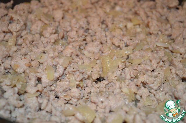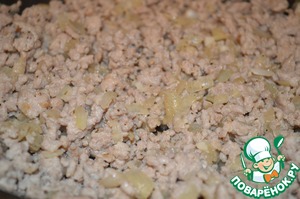 Обжарить в сковороде лук и чеснок до золотистого цвета. Добавить фарш, соль и специи, перемешать и жарить до готовности.