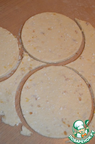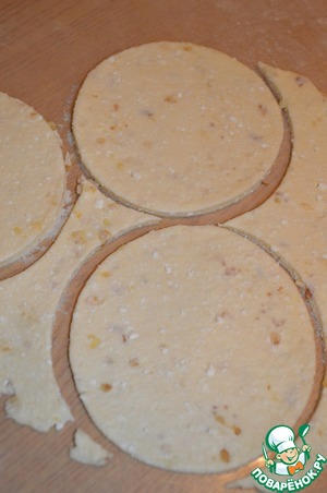 Тесто вынуть из холодильника, раскатать толщиной 0,5 см и вырезать лепешки.