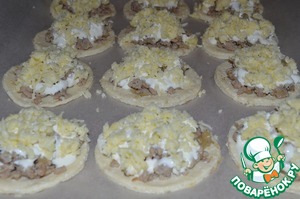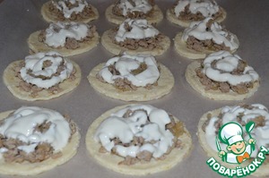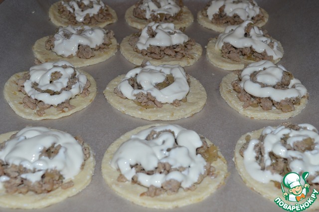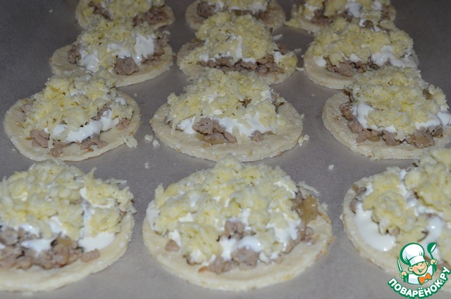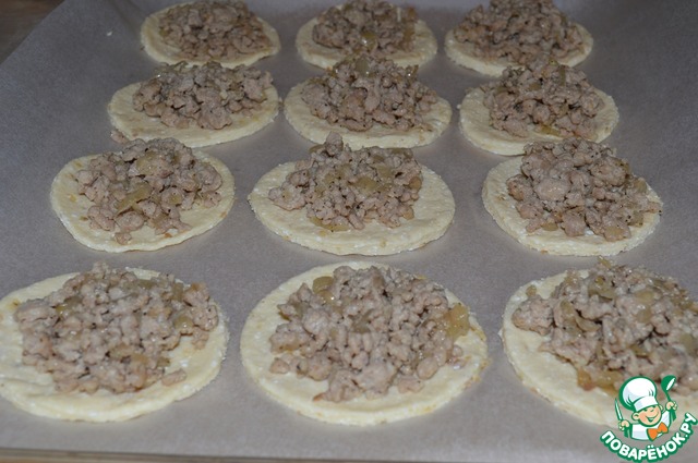 Противень застелить пергаментом. Выложить на него лепешки, сверху положить фарш.