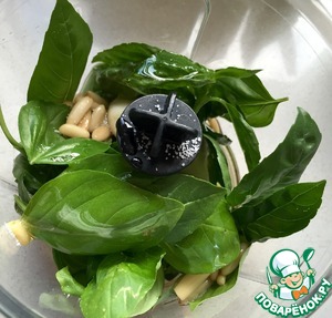 В чаще блендера измельчить базилик, чеснок, кедровые орешки и оливковое масло. Посолить! Обязательно! По вкусу!