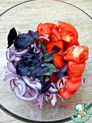 Помидоры вымыть, обсушить, нарезать крупными кубиками. Лук очистить и нарезать тонкими полукольцами. С веточек базилика отделить листики, порвать руками или оставить целиком.