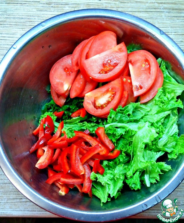 Зелень хорошо моем, стряхиваем воду. Базилик и петрушку мелко режем, листья салата рвем руками на произвольные куски. Помидор и перец помыть, обсушить. Помидор порезать дольками, перец тонкими брусками.