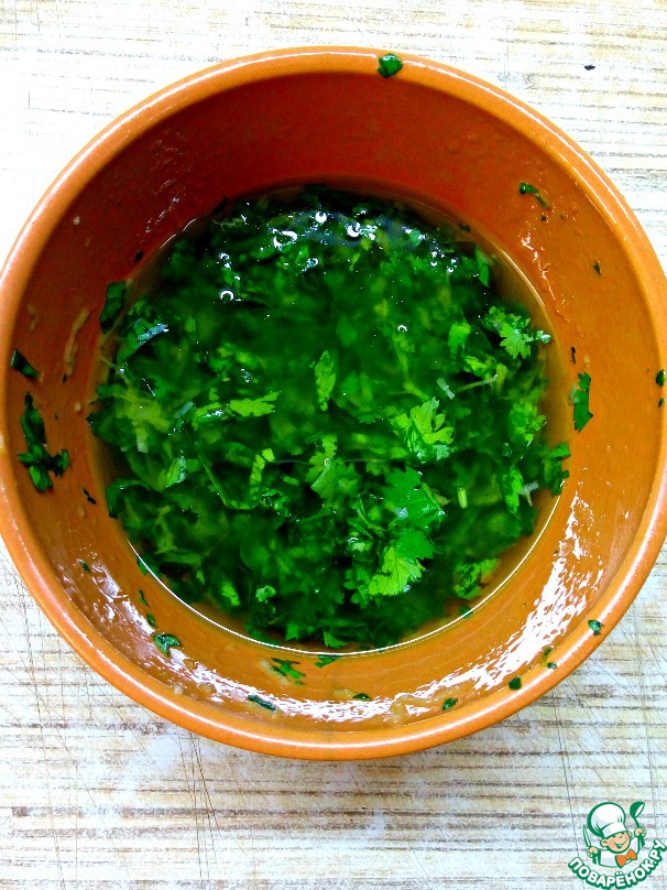 Приготовим заправку. Кинзу вымыть, обсушить, мелко нарезать. Добавить, пропущенный через пресс, чеснок. Растереть пестиком чеснок и кинзу. Добавить оливковое масло и сок лимона. Тщательно перемешать.