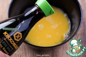 3. В миску разбить яйцо, добавить соевый соус, слегка взбить вилкой.