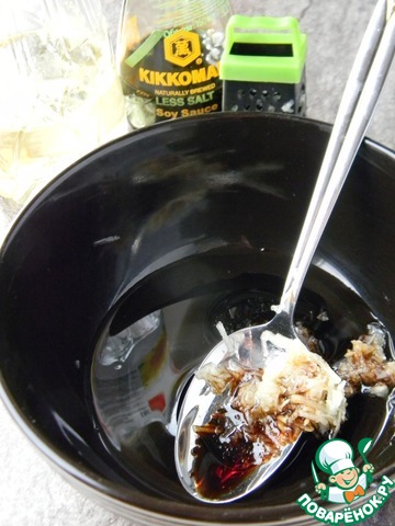 Для маринада смешать в миске масло, натертый чеснок и соевый соус. -