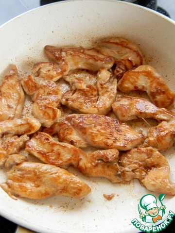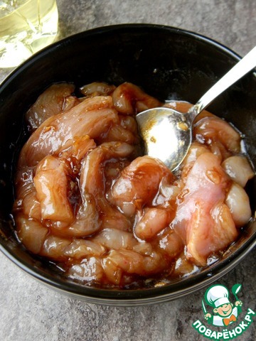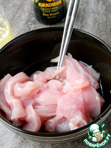 Филе нарезать тонкими пластинками. Положить в маринад.