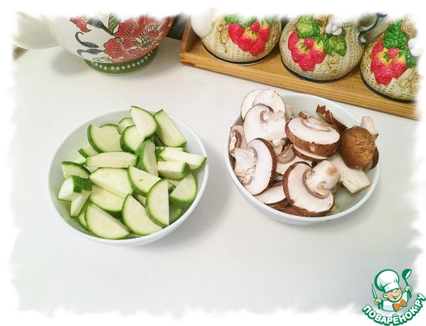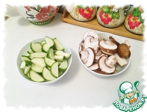 Овощи помыть. Грибы порезать слайсами, цуккини полукружочками не тонко.