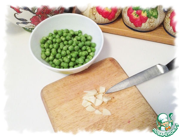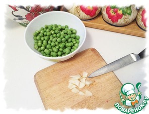 Зелёный горошек помыть, чеснок порезать тонкими небольшими слайсами.