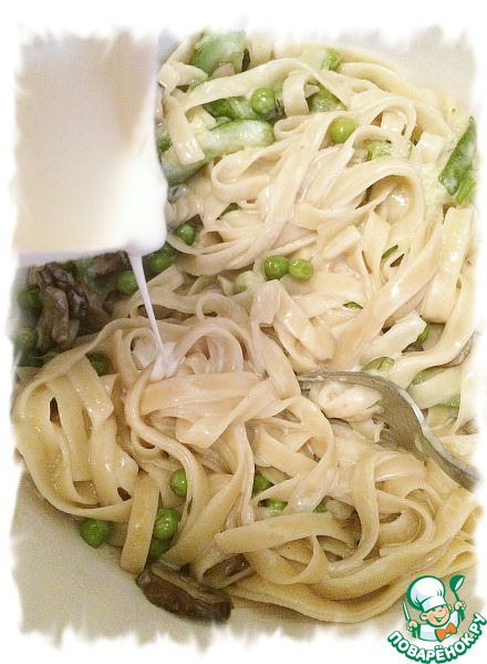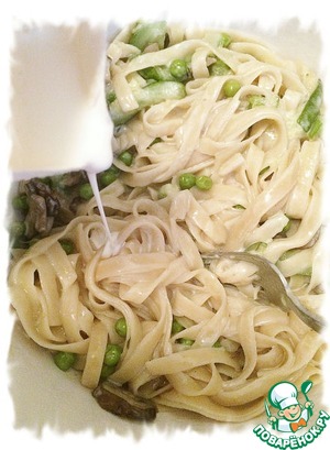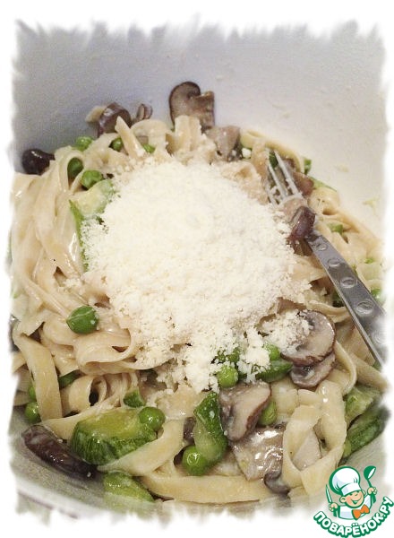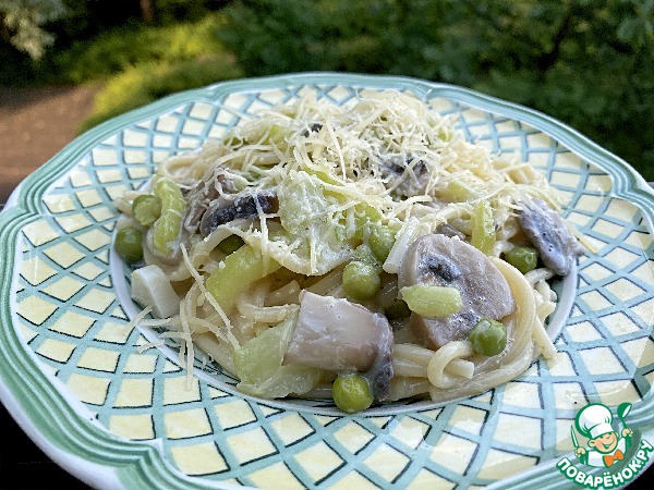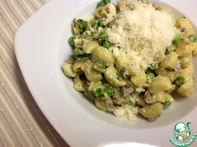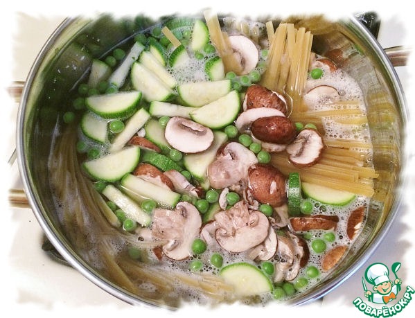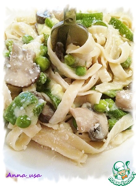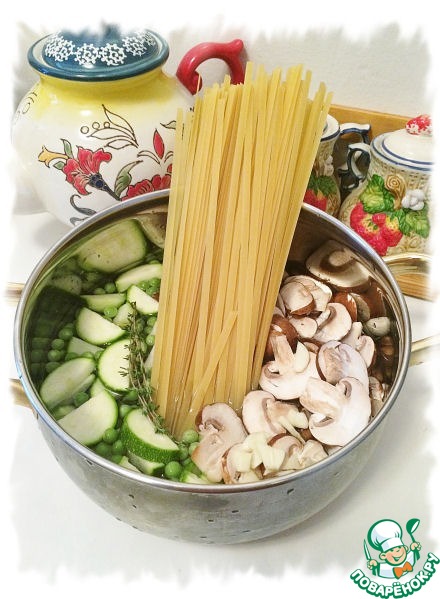 Рецепт «Спагетти с цуккини, грибами и зелёным горошком»: