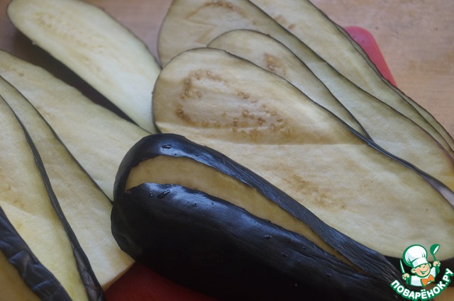 Баклажаны промыть, обрезать черешок и нарезать пластинами, пимерно по 5 мм