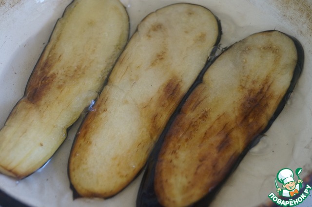 Обжарить на сковороде с оливковым маслом с обеих сторон, также можно обжарить на гриль-сковороде до мягкости. Готовые баклажаны выложить на бумажные салфетки, чтобы в них впитался лишний жир.