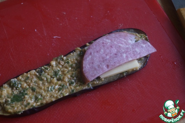 Сыр и колбасу нарезать небольшими ломтиками и выложить по 1 кусочку на край баклажана.