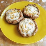 В каждое гнездо выложить по десертной ложке начинки. У меня были крупные куриные яйца, поэтому начинка получилась жидковатой, но это не беда: запечется - и все равно будет вкусно!!