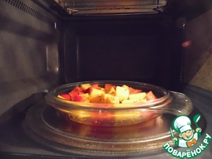 Овощи запечь в микроволновке на максимальной мощности 4-5 минут. Через 3 минуты нужно проверить на мягкость и помешать.