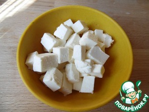 Фетаки нарезать небольшими кубиками. Подготовленные овощи и сыр выложить на хлеб.