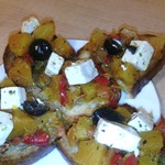 Перец и тыкву нарезать небольшими кубиками. Переложить в стеклянную жаропрочную форму для СВЧ, полить 2 ст. л. оливковым маслом, приправить солью, перцами и итальянскими травами.