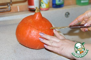 Срезаем верхушку у небольшой, но спелой тыквы.