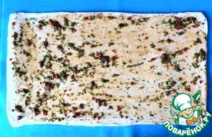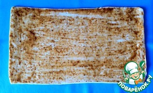 Тесто раскатать в прямоугольный пласт, толщиной 5 мм. Смазать его соусом.