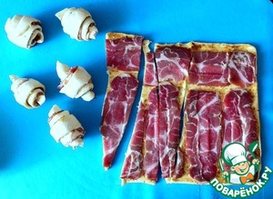 Поверх выложить ломтики сыровяленого мяса. Разрезать тесто вместе с начинкой на треугольники и свернуть рогалики.