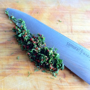 Измельчить укроп и перец чили.