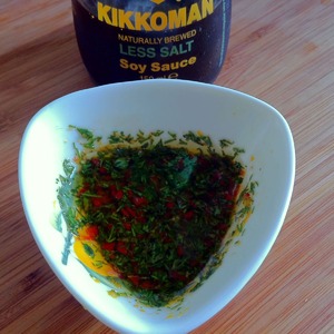 Смешать оливковое масло, легкий соевый соус, лимонный сок, перец чили и укроп.