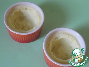 Две жаропрочные порционные формочки для запекания смазать сливочным маслом. Распределить по дну и стенкам формочек заранее подготовленное картофельное пюре.