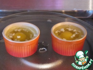 Запекать 2 минуты 40 секунд при мощности 1000 вт. Я вначале выставила время "2 минуты", а потом уже включала по 20 секунд и смотрела, как яйцо запеклось.