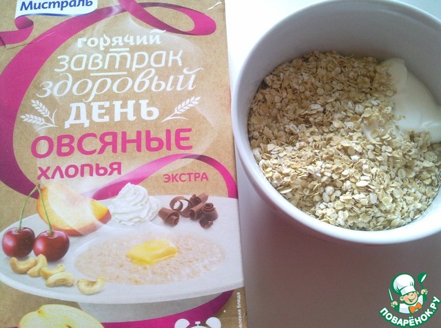 Овсяные хлопья экстра ТМ "Мистраль" залить йогуртом и перемешать. Йогурта должно быть столько, чтобы хлопья пропитались и не было сухих комочков, но и больше заливать не нужно, чтобы не получился жидкий фарш. Оставить на 20 минут, чтобы хлопья набухли.