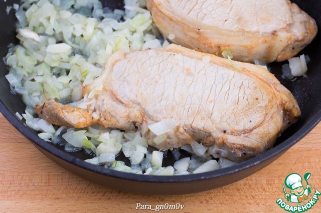 1. Мясо можно брать стейками или куском (но тогда время тушения чуть увеличится). Свинину слегка обжарить на сковороде с двух сторон. Добавить мелко нарезанный лук и обжаривать все вместе около 5 минут.