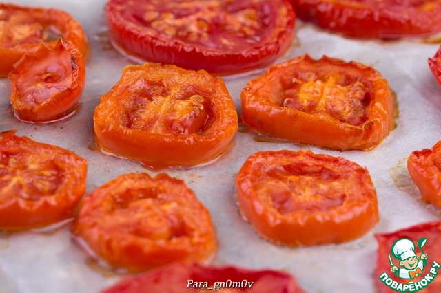 5. Прелесть бургеров состоит в том, что в них можно положить все по своему вкусу. Для одного варианта я брала свежие помидоры, для другого - запеченные. Помидоры нарезать кружочками, разложить на застеленный пергаментом противень, сбрызнуть маслом и Терияки. Запекать в разогретой до 150 градусов духовке до желаемого состояния (я запекала около 40 минут). Помидоры должны получиться сочными, но менее влажными, с более насыщенным вкусом.