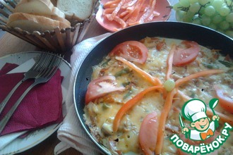 В мисочке соединить 3 яйца, молоко, соль, перец, петрушку и всё взбить вилкой.