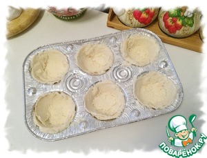 Формочки для маффинов смазать растительным маслом, присыпать мукой и утрамбовать кружочки в формочки. Я использовала однорзовую маленькую форму, так как делала корзиночки в небольшой электрической настольной духовке. Это очень удобно (особенно летом), рекомендую. Поставить на 5 минут в разогретую до 180*C (350*F) духовку.