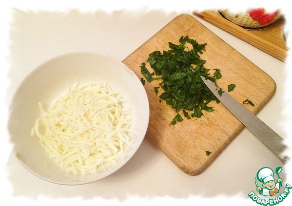 Моцареллу натереть на крупной тёрке, петрушку мелко нарезать.