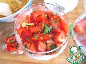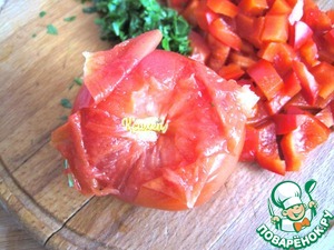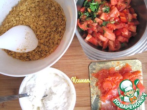 Помидоры нарежем мелким кубиком. В небольшой посуде смешаем перец, помидоры и петрушку. По вкусу солим. Подсоленным овощам я дала 5 минут постоять, затем слила выделившийся сок, что б закуска не была водянистой. Рикотту слегка взобьём вилочкой и посолим по вкусу, сёмгу нарежем мелко.