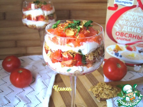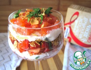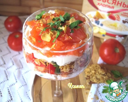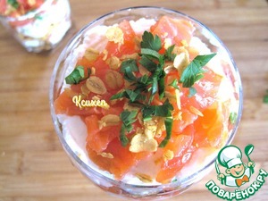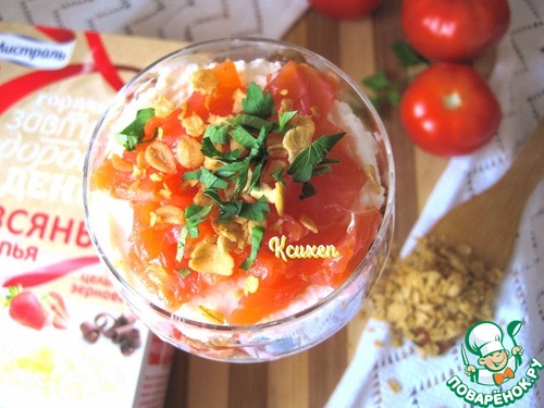 .. далее слой рикотты. Повторяем слои:овощи-гранола-р икотта. На верхний слой рикотты выкладываем сёмгу, украшаем небольшим количеством гранолы и петрушки.