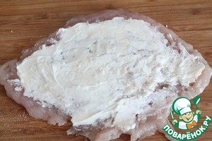 Куриное филе солим, перчим и посыпаем молотым чесноком. Творожный сыр равномерно размазываем.