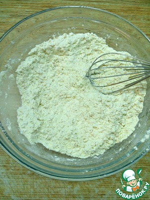 Соединить в миске муку, хлопья, соль, сахар и соду. Если вы боитесь привкуса соды, добавьте ее в конце, предварительно погасив. Венчиком все перемешиваем.