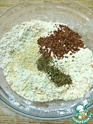 Добавим кунжут, льняное семя и травки по вкусу. Перемешиваем и добавляем кефир. Смотрите по своей муке, возможно вам потребуется больше или меньше.