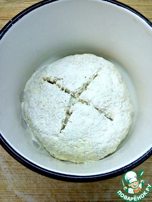 Вымешиваем тесто, формируем колобок и укладываем в форму. Делаем крестообразный надрез и присыпаем мукой. Я выпекала в кастрюле диаметром 19 см.