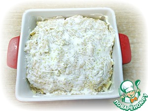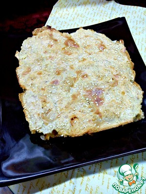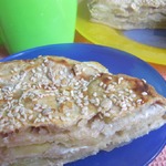 Продолжаем раскатывать пласты, смазывать сливками, начинка, сахар, хлопья. У нас получится 4 слоя теста и 3 слоя яблочной начинки. Слои не защипывать между собой и не прижимать, просто положить и аккуратно расправить. Верхний слой смазываем сливками и посыпаем кунжутом, сахаром, маком, кто-что предпочитает.
