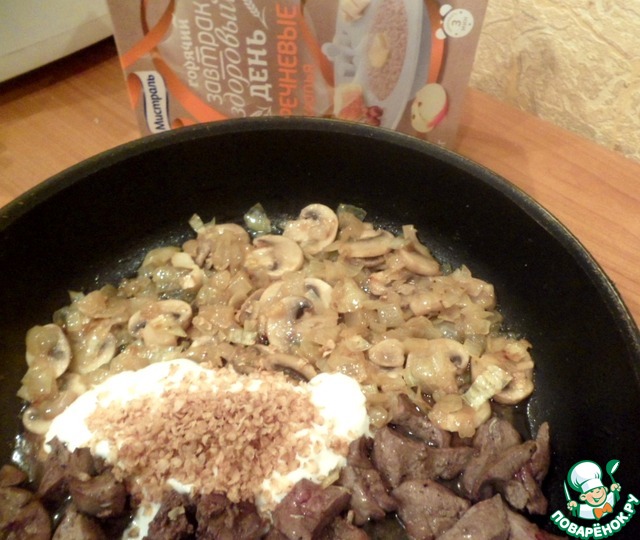 К готовой печенке добавить обжаренные шампиньоны, сметану и гречневые хлопья ТМ Мистраль. Тушим еще 3-4 минуты.