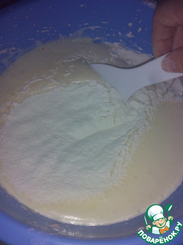 Добавить муку с разрыхлителем. Аккуратно перемешать массу лопаточкой.