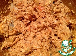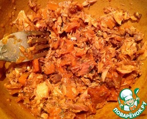 Вилкой разминаем скумбрию (у меня была скумбрия в томате с овощами, но и просто в масле тоже подойдет).