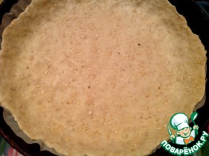 Форму выстилаем бумагой для выпечки, смазываем ее чуть чуть растительным маслом. Формируем с теста основу с бортами. Отправляем основу в разогретую до 240 градусов духовку на 5 мин. В это время приготовим заливку.