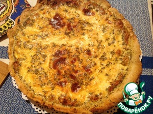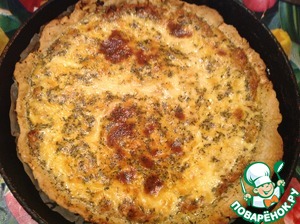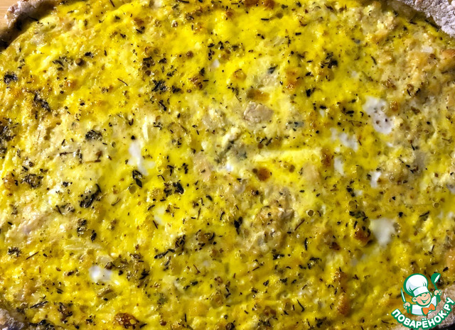 Вынимаем основу пирога с духовки. Убавляем температуру до 210 градусов. Поверх основу равномерно распределяем начинку, сверху выливаем заливку и отправляем в духовку.