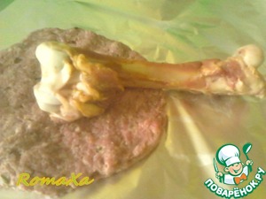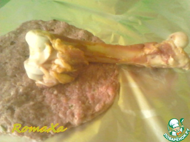 Расстилаем фольгу, из 1/3 фарша формируем лепёшку, кладём кость голени индейки