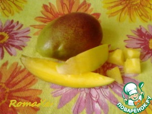 Манго разрезать до косточки на дольки, отделить их по отдельности, очистить от кожицы и нарезать кубиками