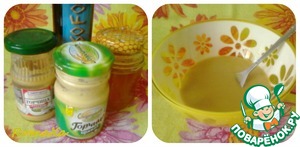 Взбить вилкой дижонскую горчицу, потихоньку вливая оливковое масло и добавить к этой смеси мед. Хорошо размешать.