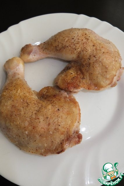 Куриные окорочка обжарить на раскаленной сковороде до полуготовности. Солим и перчим с двух сторон. Остывшие окорочка, освобождаем от костей и нарезаем небольшими кусочками.